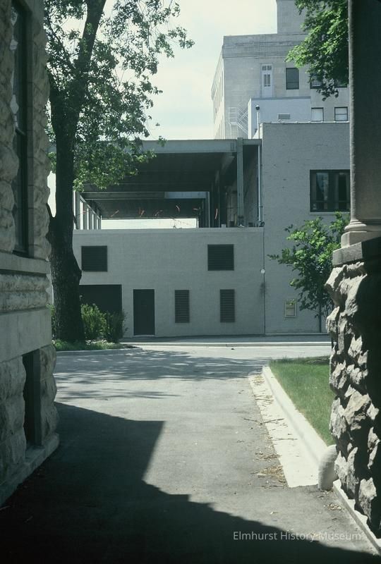 Expansion of the Elmhurst National Bank building at 105 S. York Street, looking west from the porte- ochere of the Glos Mansion.Photograph Details
