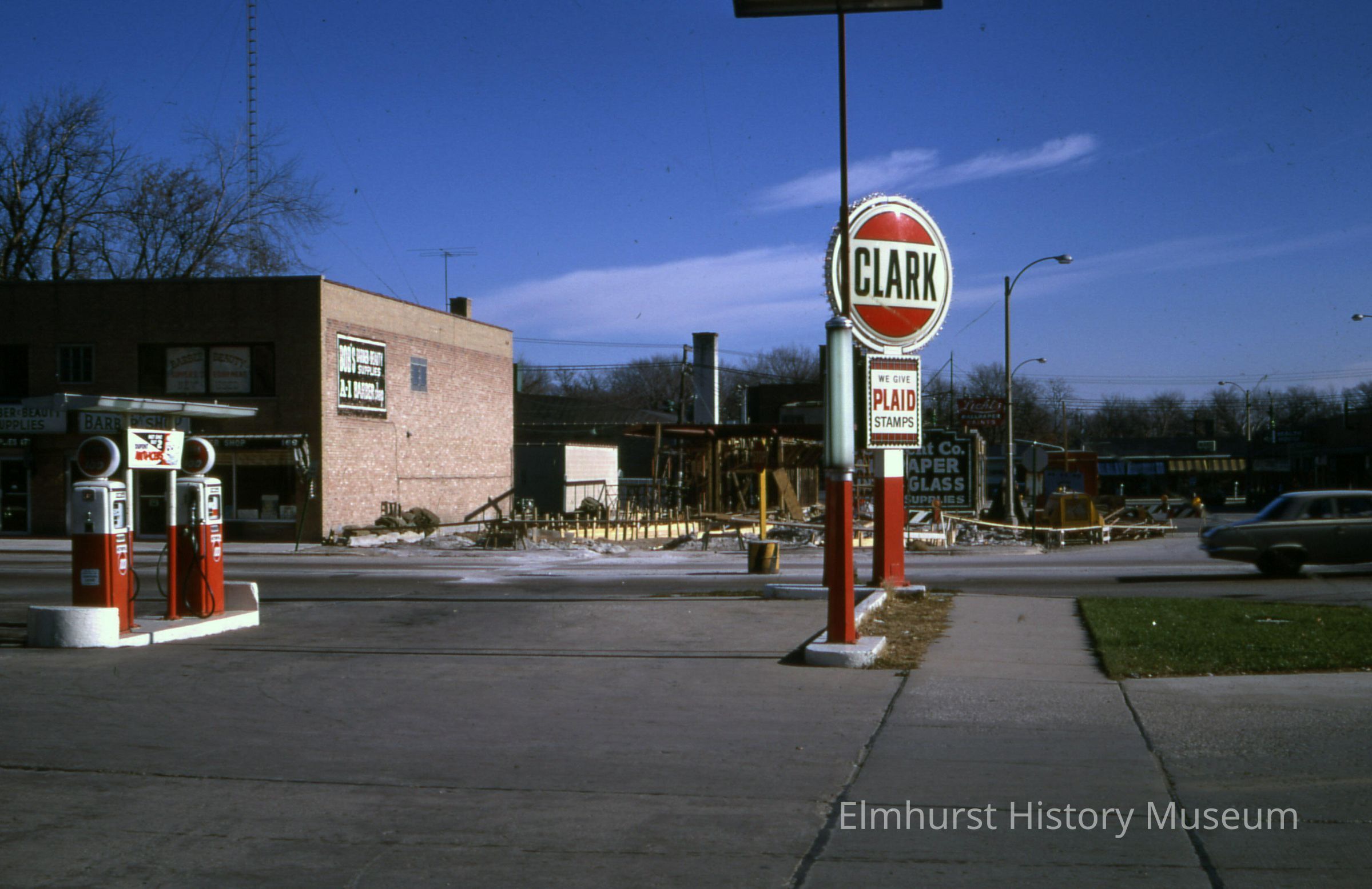 Northeast corner of Addison Avenue and Second Street, where the Elmhurst National Bank Drive-in is under construction. The Clark gas station at 168 N. Addison is in the foreground.Photograph Details