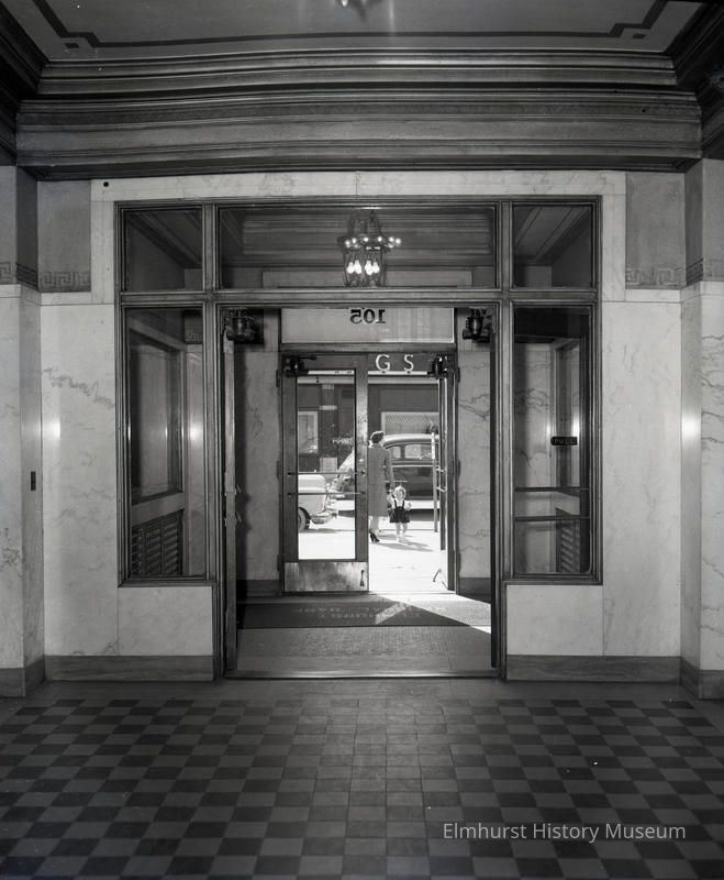 Elmhurst National Bank interior door, looking out at Ollswang's Department Store on S. York Street.Photograph Details