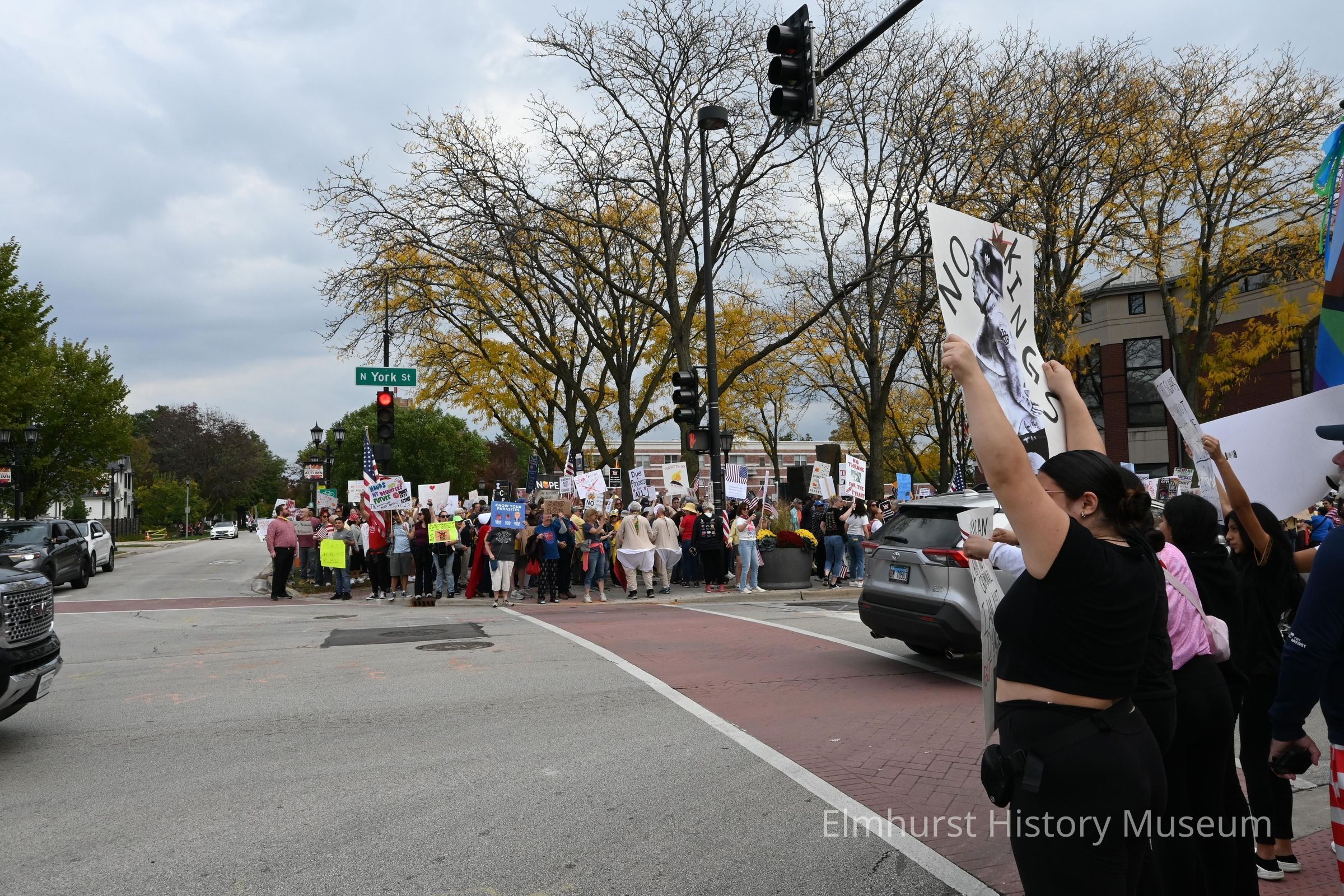 No Kings march protesting against the Trump administration in front of Elmhurst City Hall.Photograph Details