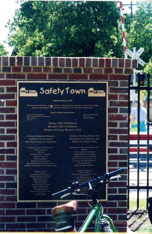 Elmhurst Park District Safety Town sign "Dedicated May 22, 1997." Safety Town is an Elmhurst Park District facility dedicated to teaching road safety to children, located at 511 S. York StreetPhotograph Details