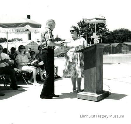 Ernest Wilbur receiving a citation from Elmhurst Park District Board President, Joanne Wagner, at York Commons Pool opening day ceremonies. York Commons Pool, 665 S. York Street, was later renamed Norman P. Smalley PoolPhotograph Details