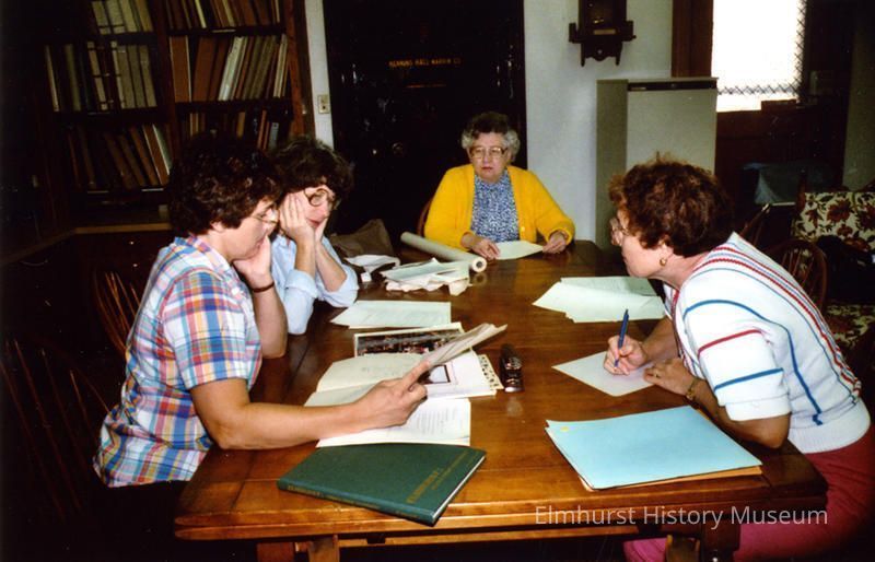 Elmhurst Piecemakers In Elmhurst Historical Museum's research room, planning the Elmhurst Sesquicentennial QuiltPhotograph Details