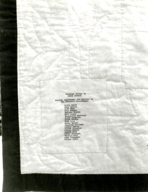 Original design by Laura Peters. Pieced, appliqued and quilted by the Elmhurst Piecemakers. Kathy Smith, Mary Conley, Ruth Vann, Kris Runyan, Darlene Winter, Patt Russo, Georgianne Anderson, Betty Burgener, Diane Burdin, Ruth Rice, Betty Gaebel, Jeanette Hilliger, Joanne Lahvic, Elaine Libovicz, Evelyn Pierce, Genova Mack, Edith Thompson, Marilyn Krol, Anne Youngdahl, Eileen Dolan