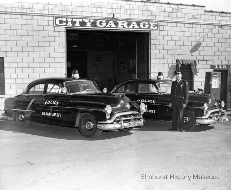 Police chief Wilbert Rusteberg with police cars at the City Garage, which was located in the Schiller Street and N. Kenilworth Avenue City complex.Photograph Details