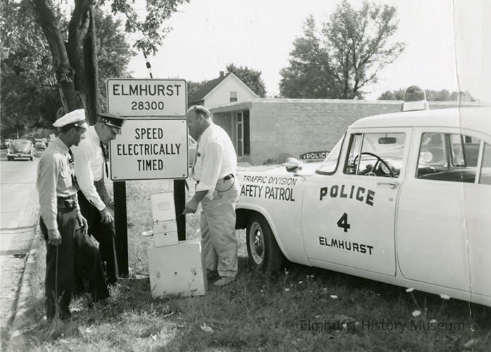 Two police officers and third man working a city sign "Elmhurst 28300" and "Speed Electrically Timed." Traffic Division Safety Patrol Police car "4" is on the right.Photograph Details