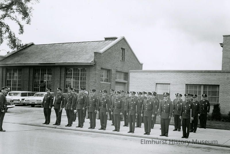 Elmhurst Police Department inspection. The police officers are wearing new uniforms in front of the police station at 118 Schiller Street.Photograph Details
