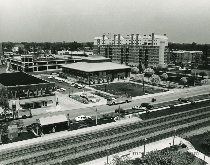 Looking northeast from the roof of the Old Kent Bank building at 105 S. York Street, with images of Elmhurst Police station, the Schiller Street municipal parking deck and Elmhurst Place apartments.Photograph Details