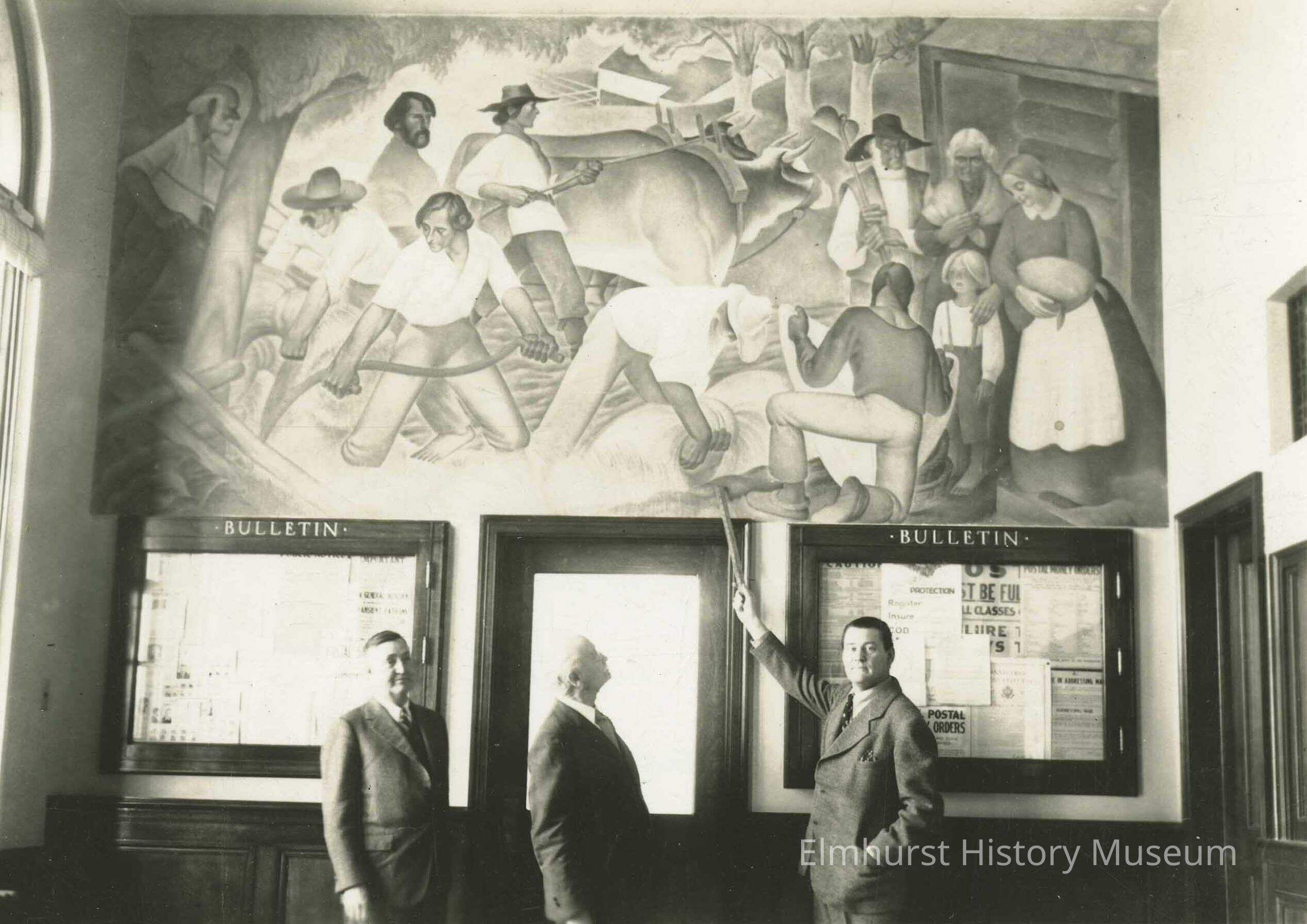 The lobby of the Elmhurst Post Office, 154 W. Park Avenue, with the mural "There Was Vision" by George M. Smith. Those pictured are J. Tubergen, assistant postmaster; James F. Grogan, Postmaster; and muralist George M. Smith.Photograph Details