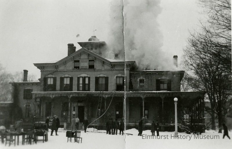 East facade of Elmhurst Public Library in the Wilder Mansion, during a fire.Photograph Details