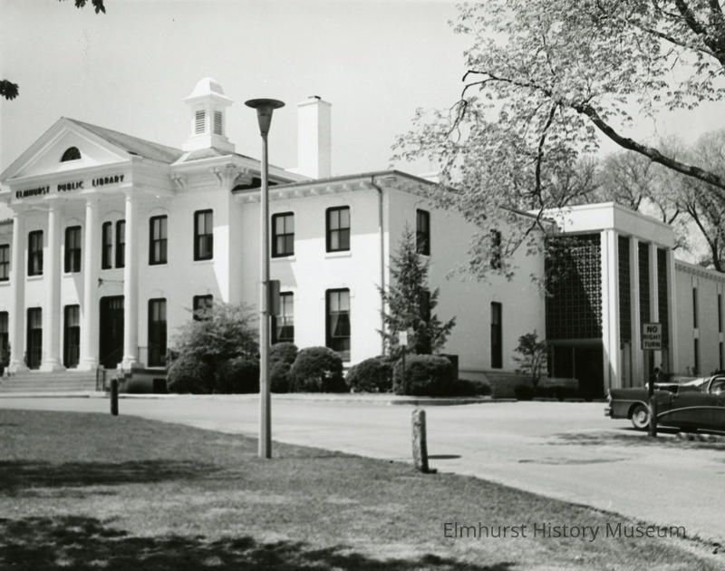 East façade of the Elmhurst Public Library located in Wilder Park. 1965 addition is pictured to right.Photograph Details