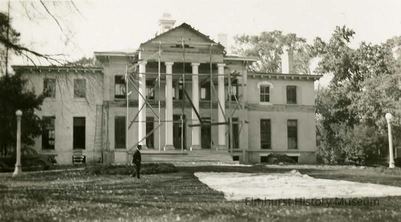 The east façade of Elmhurst Public Library during the remodeling when the wrap-around porch of the Wilder Mansion was removed, and columns were installed.Photograph Details