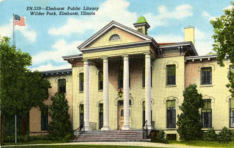 Printed in black ink on the front right corner "Ett.339 - Elmhurst Public Library Wilder, Elmhurst, Illinois." Printed in blue ink on back "Elmhurst Public Library Located in the heart of Wilder Park. This library houses 20,000 volumes and was formerly the home of Thomas E. Wilder." Written in red on back "Built 1868." Publisher is "Genuine Curteich-Chicago" as printed on the back.