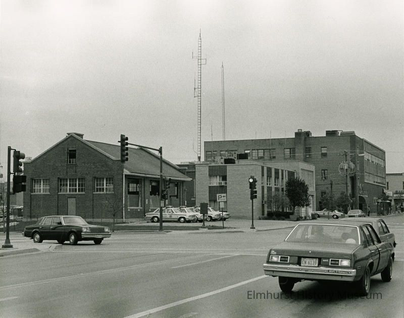 Looking southwest on Schiller Street at Robert Palmer Drive: Elmhurst Pumping Station, Police Station (118 Schiller), Fire Station (116 Schiller) and Elm Square Building are visible.Photograph Details