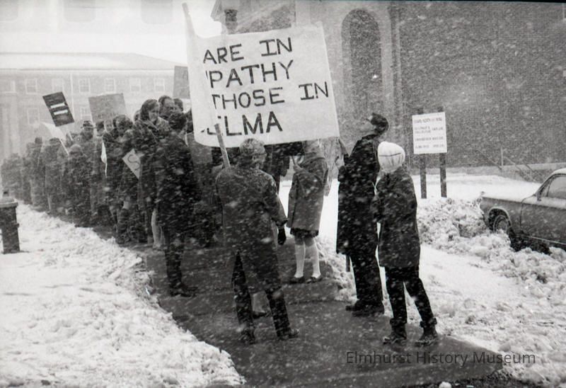 Elmhurst residents and Elmhurst College students march in sympathy with the Selma to Montgomery Civil Rights marchers in March of 1965. The activists marched from Hammerschmidt Chapel at Elmhurst College to the front steps of Elmhurst City Hall in the Glos Mansion.Photograph Details