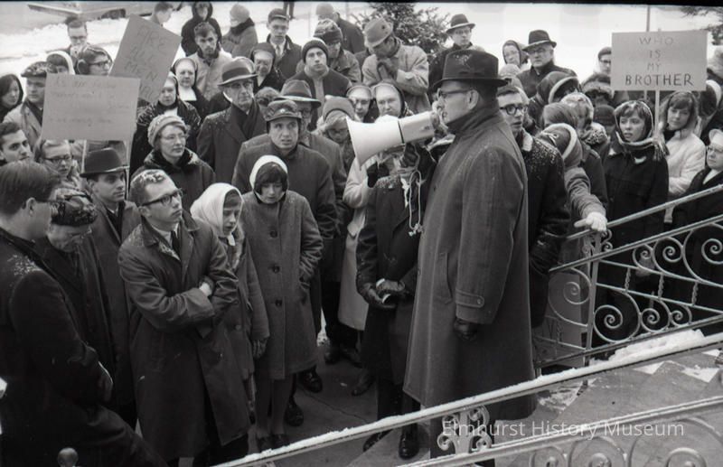Elmhurst residents and Elmhurst College students march in sympathy with the Selma to Montgomery Civil Rights marchers in March of 1965. The activists marched to the front steps of Elmhurst City Hall in the Glos Mansion.Photograph Details