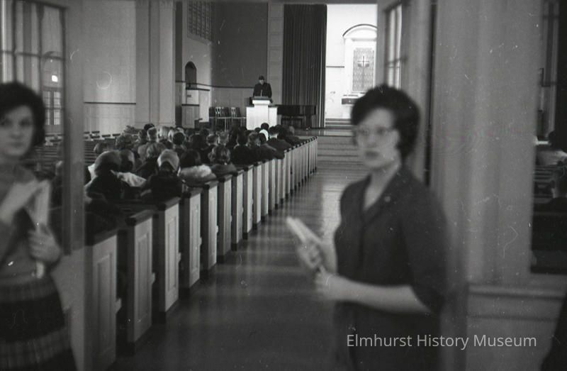 Elmhurst residents and Elmhurst College students march in sympathy with the Selma to Montgomery Civil Rights marchers in March of 1965. The activists began the march in Hammerschmidt Chapel at Elmhurst College.Photograph Details