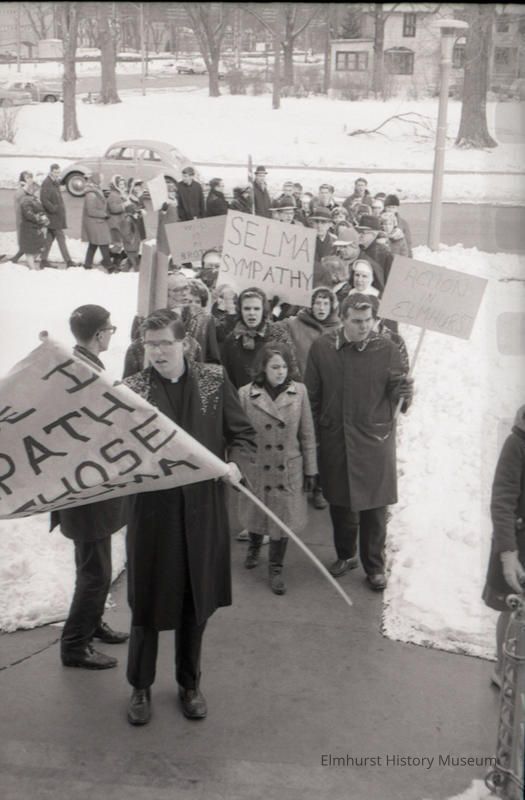 Elmhurst residents and Elmhurst College students march in sympathy with the Selma to Montgomery Civil Rights marchers in March of 1965. The activists are marching towards Elmhurst City Hall in the Glos Mansion.Photograph Details