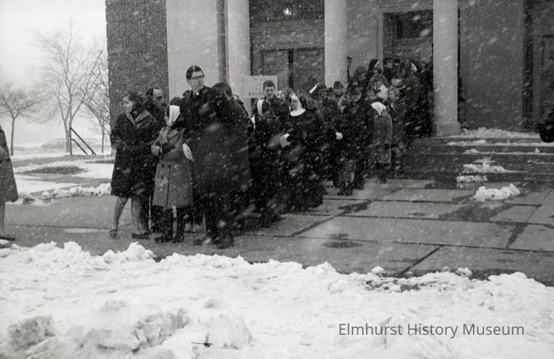 Elmhurst residents and Elmhurst College students march in sympathy with the Selma to Montgomery Civil Rights marchers in March of 1965. The activists began the march at Hammerschmidt Chapel at Elmhurst College and ended at Elmhurst City Hall.Photograph Details