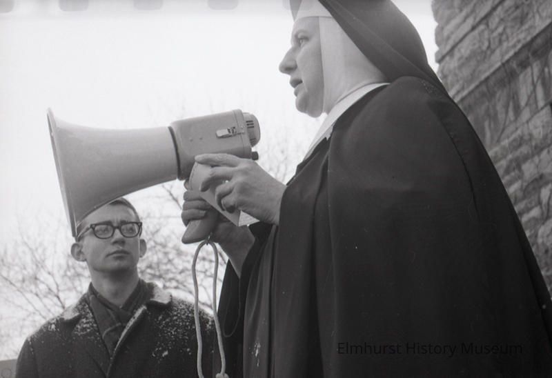 Elmhurst residents and Elmhurst College students march in sympathy with the Selma to Montgomery Civil Rights marchers in March of 1965. The activists marched to the front steps of Elmhurst City Hall in the Glos Mansion.Photograph Details
