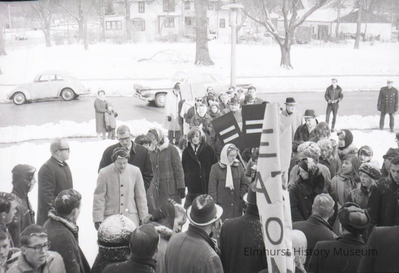Elmhurst residents and Elmhurst College students march in sympathy with the Selma to Montgomery Civil Rights marchers in March of 1965. The activists marched to the front steps of Elmhurst City Hall in the Glos Mansion.Photograph Details