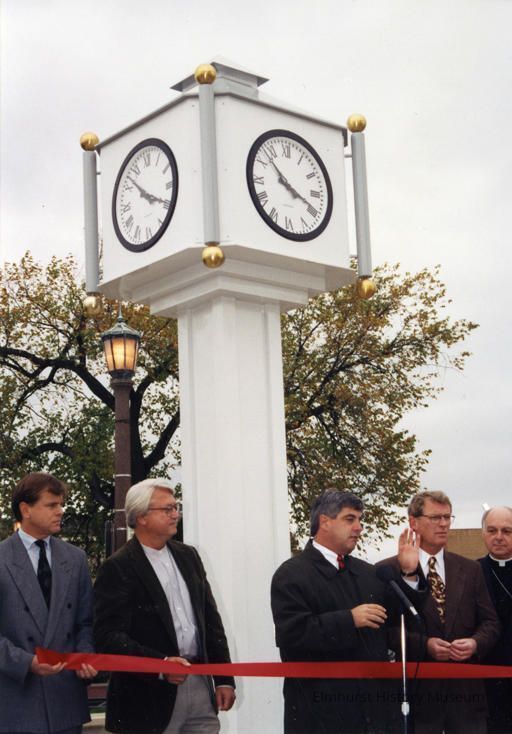 Ribbon-cutting at the dedication of the Elmhurst Sesquicentennial Clock at York Street and Park Avenue. Elmhurst Mayor Thomas Marcucci is at the microphone.Photograph Details