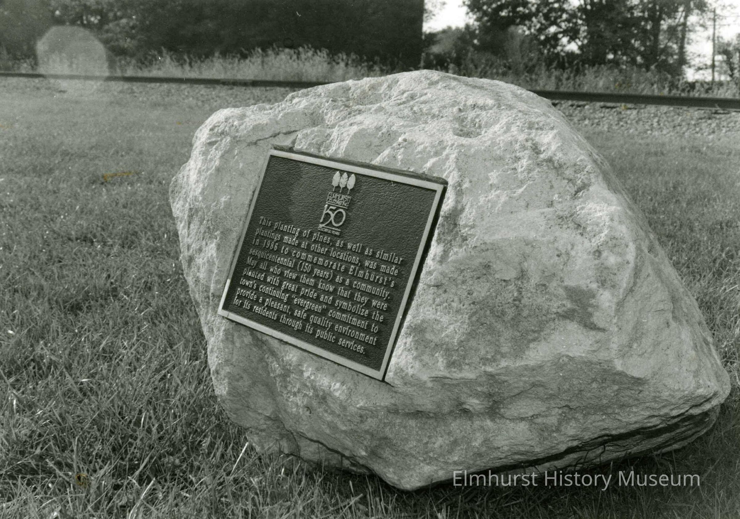 A plaque on the southeast corner of West and Elm Park Avenues commemorating a tree-planting in honor of Elmhurst's Sesquicentennial.Photograph Details