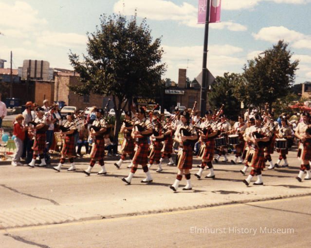 Bagpipers marching in the Elmhurst Sesquicentennial ParadePhotograph Details
