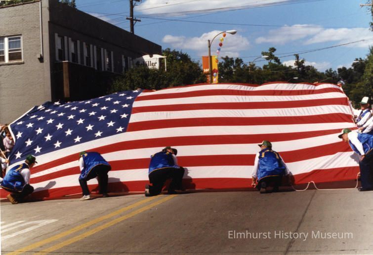 Kiwanis Club members display an American flag in the Elmhurst Sesquicentennial paradePhotograph Details