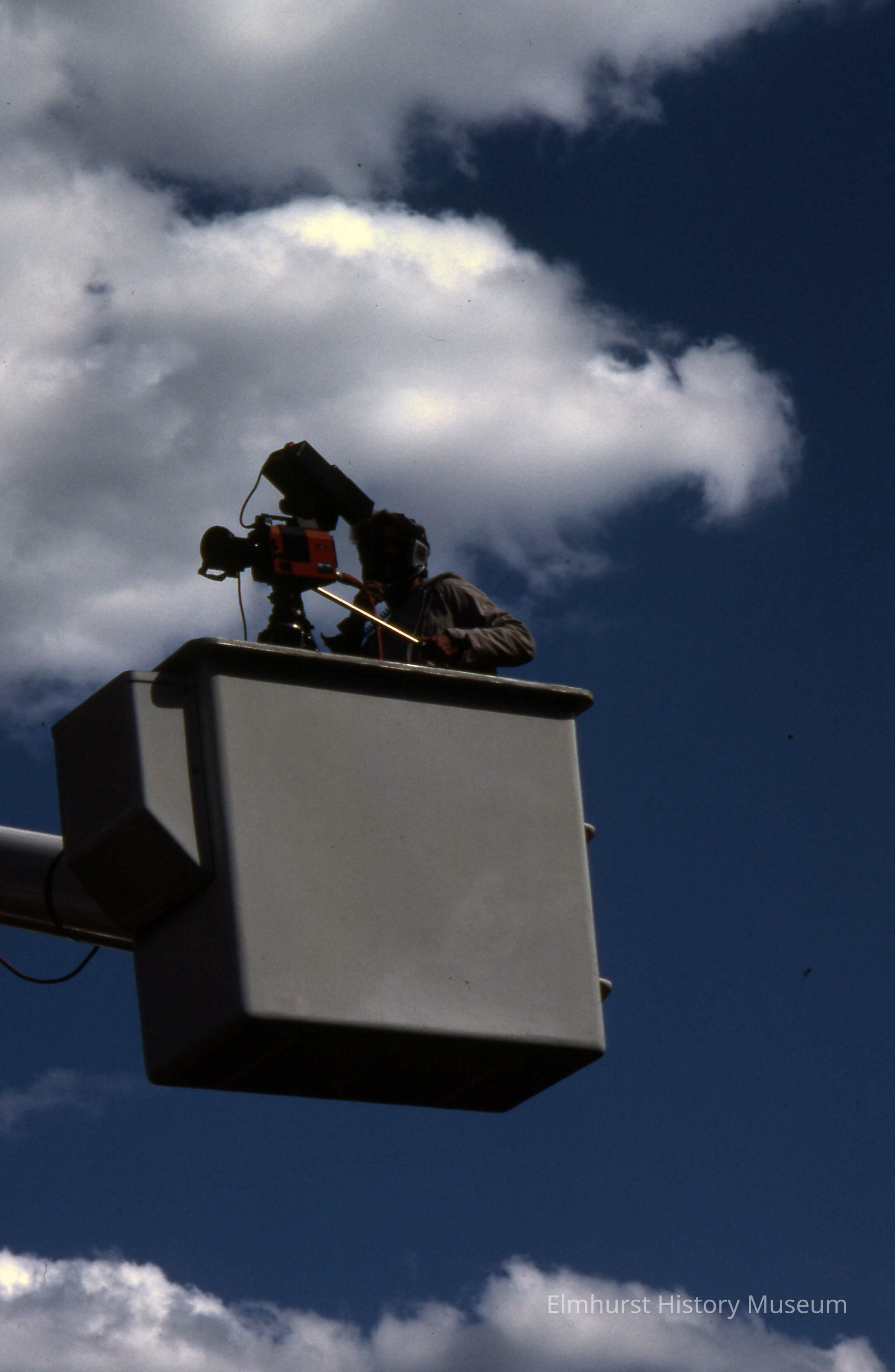 Camera man in a "cherry picker" taping the Elmhurst Sesquicentennial paradePhotograph Details