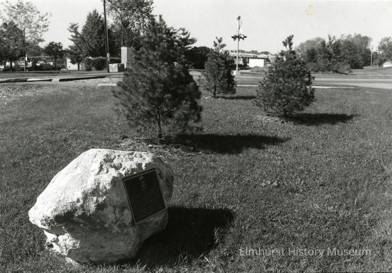 Written on back of image: Pine trees planted on SE corner of West Ave. and Elm Park - commemorating Elmhurst's Sesqui / Photo taken by Walt Purdy Sept 1986