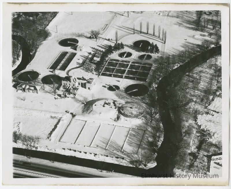 Aerial view of sewage treatment plant in snow. Salt Creek is along the right edge of the view.