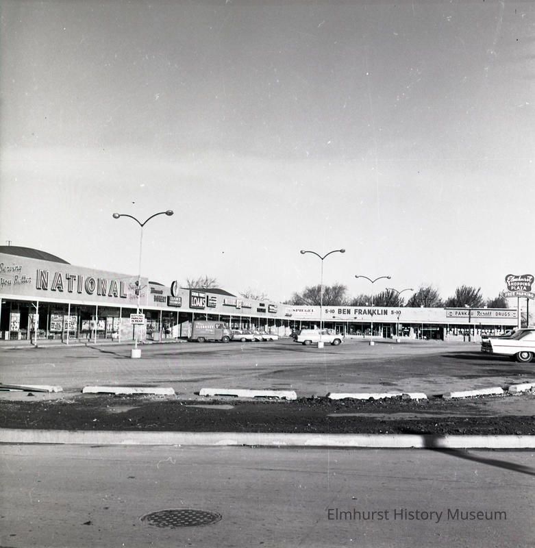 Elmhurst Shopping Plaza at York and Butterfield Roads. Pictured businesses include the National Food Store, Ben Franklin Five and Dime.Photograph Details