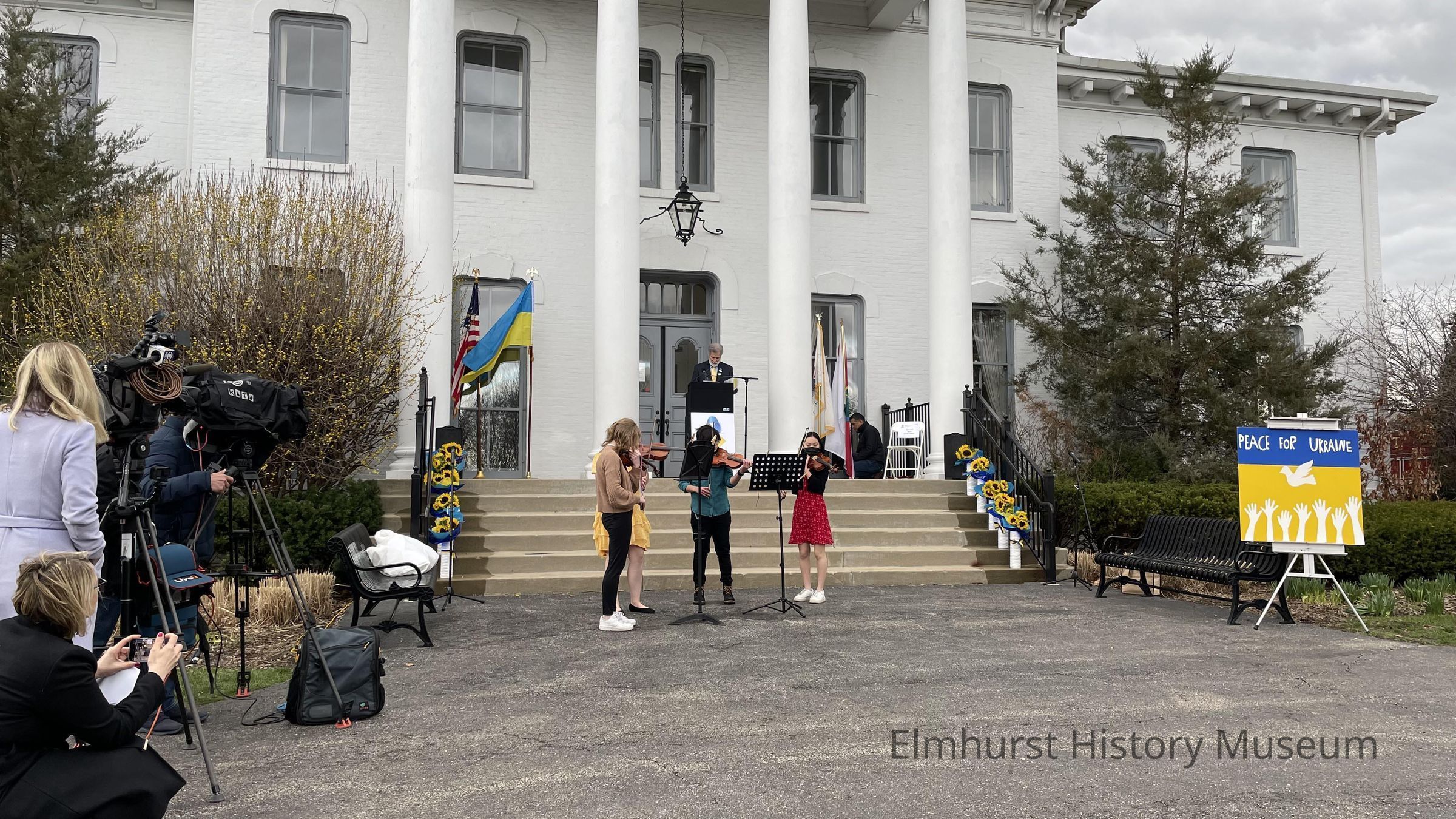Members of the York Community High School symphony orchestra play the Ukrainian national anthem in front of the Wilder Mansion as a part of a community fundraising event in support of Ukraine following its invasion by Russia.Photograph Details
