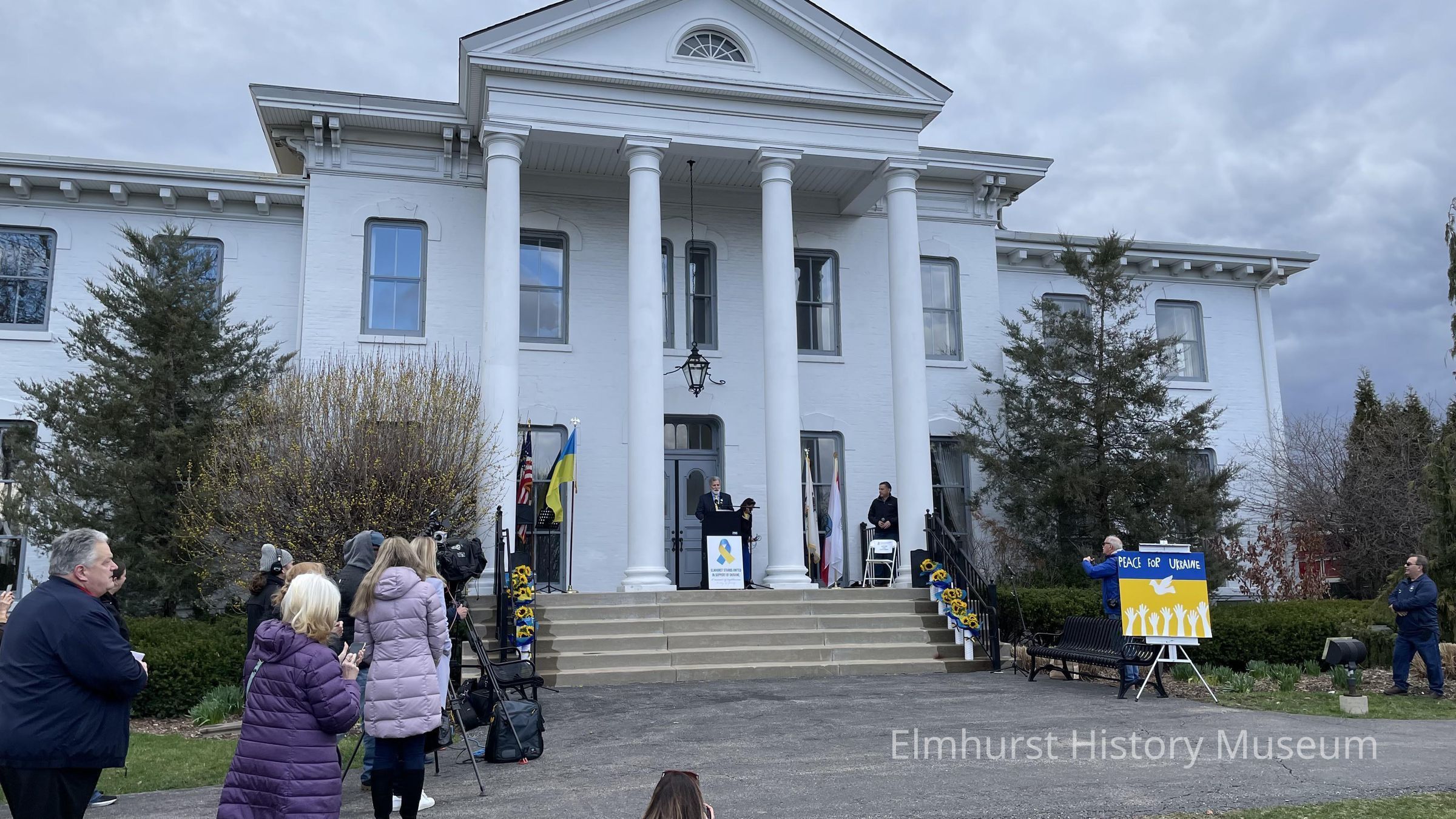 Elmhurst mayor Scott Levin speaks in front of the Wilder Mansion as a part of a community fundraising event in support of Ukraine following its invasion by Russia.Photograph Details