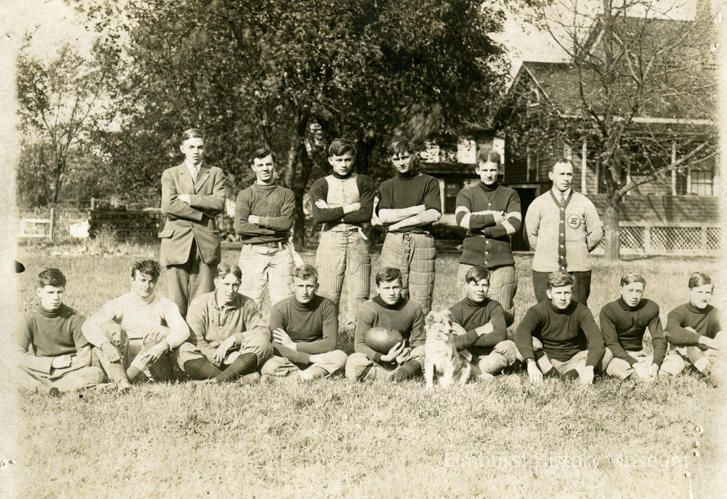 Elmhurst Teddy Bears football team at corner of Addison and Second Streets. Label attached to the front lists the names of the players, manager and coach.Photograph Details