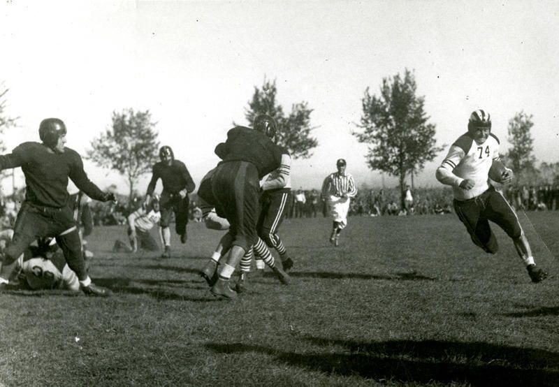 Action shot of the Elmhurst Travelers football team and opponents.Photograph Details