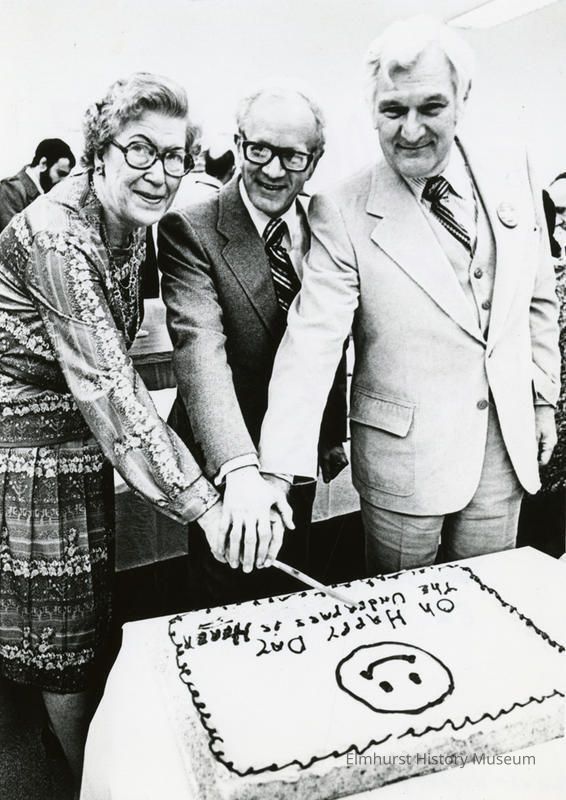 Cake-cutting at ceremony at the opening of the Elmhurst Underpass. Jean Baker, Mayor Ray Fick, Jr. and Ed VertovecPhotograph Details