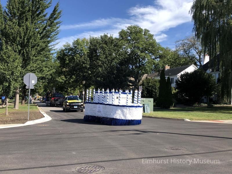 Elmhurst University 2021 Homecoming parade, merging on to Prospect Avenue. It is a Sesquicentennial anniversary cake floatPhotograph Details