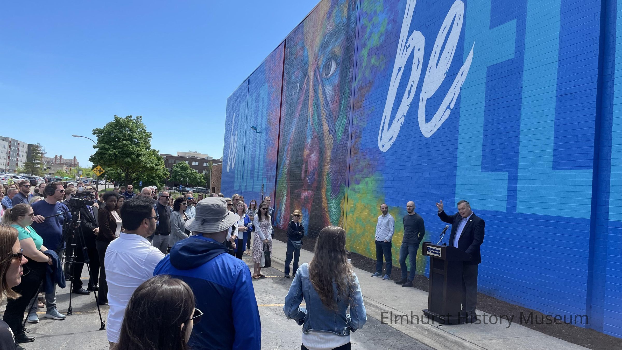 Elmhurst University president Troy VanAken speaks at an unveiling ceremony for the recently completed "Be Bold. Be Elmhurst." public art mural on the north wall of Faganel Hall at Elmhurst University, along W. Park Avenue.Photograph Details
