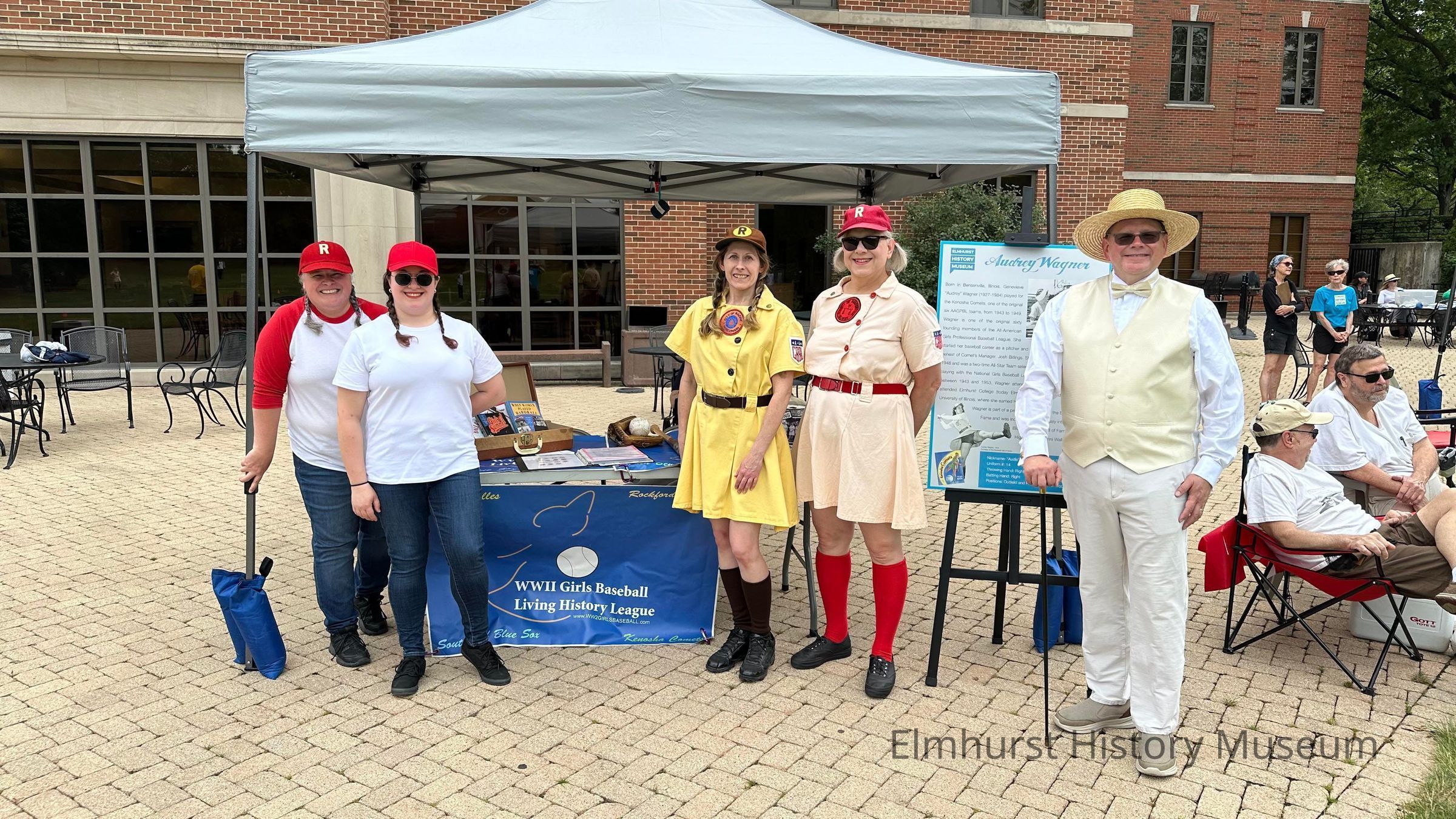 WWII Girls Baseball Living History League reenactors pose with EHM director Dave Oberg at the Elmhurst Town vs. Gown vintage baseball game on the Elmhurst University Mall.Photograph Details
