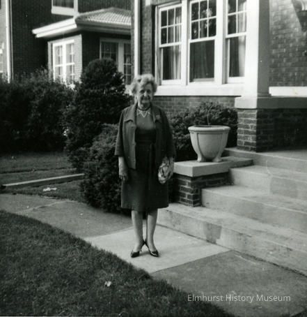 Snapshot of Elsa Chandler Fischer standing on sidewalk in front of a brick housePhotograph Details