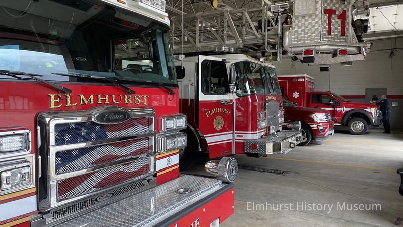 Emergency response vehicles parked in the garage of Fire Station No. 1 at 404 N. York Street.Photograph Details