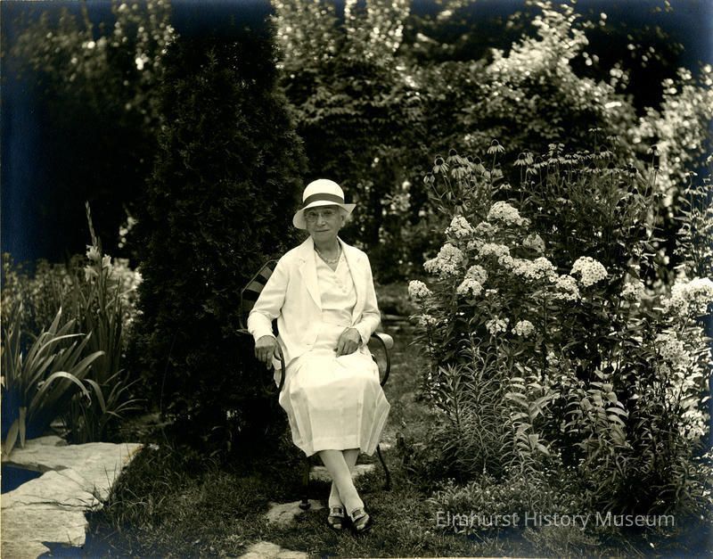 Portrait of Emma Schween Glos (Mrs. Jacob) seated in her garden at 159 Cottage Hill Avenue.Photograph Details
