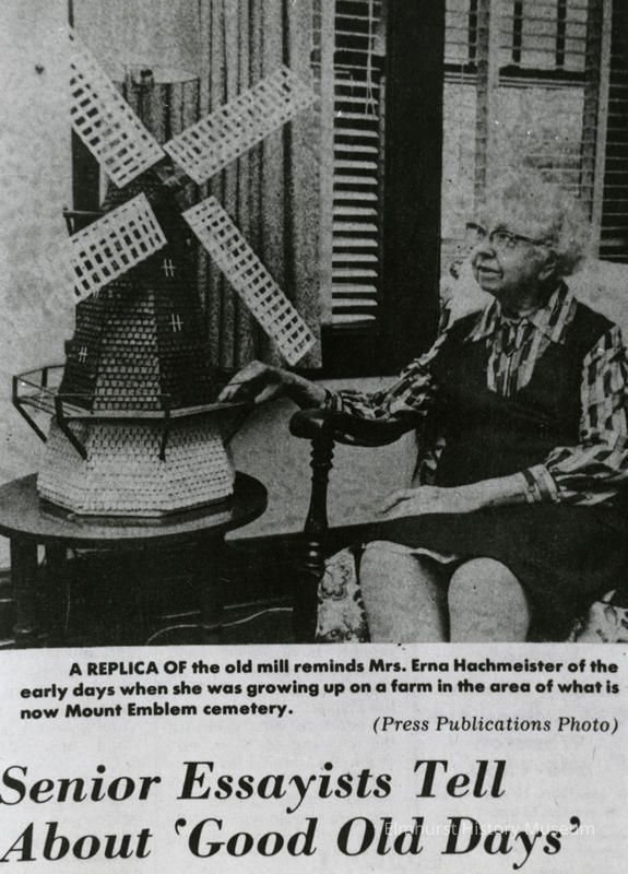 Mrs. Erna Hachmeister seated in a chair next to a replica of the windmill at Mount Emblem Cemetery. Caption indicates she grew up on a farm in the area of the cemetery. Photo accompanied an article "Senior Essayists Tell About 'Good Old Days'"Photograph Details