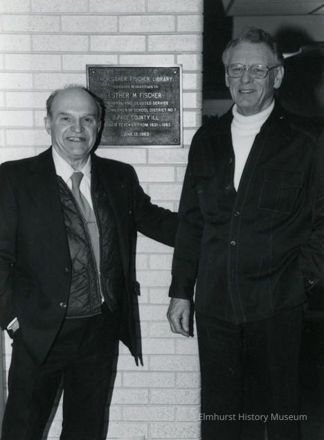 Louis Cornielle and Monroe Fischer next to a plaque for the "Esther Fischer Library" at the newly-constructed Churchville Jr. High at 155 Victory Parkway.Photograph Details