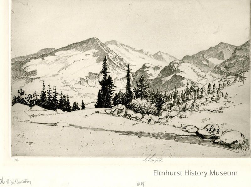 Etching: mountains in the background, trees in the midground. Mounted in a 2-page mat. #26/75. Signed and dated.