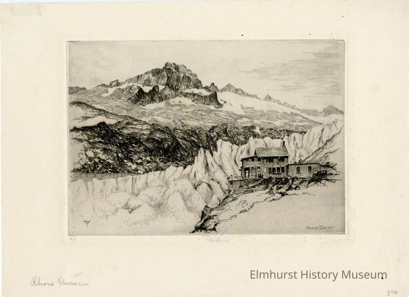 Etching of a wooden building overlooking a glacier. #2/50. Signed and dated.