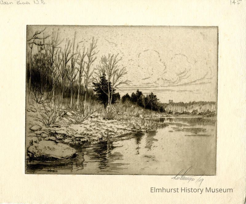 Etching: trees and brush on the river bank rising up to the left. Signed and dated.