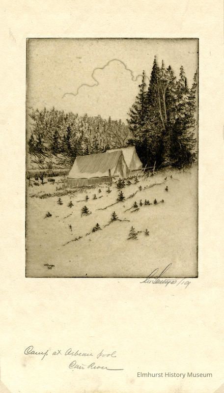Etching of a tent camp in a forest clearing, hill in background. Signed and dated.